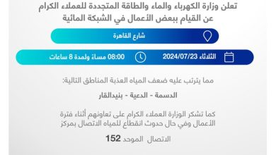أعلنت وزارة الكهرباء والماء والطاقة المتجددة عن القيام ببعض الأعمال في الشبكة المائية بشارع القاهرة الثلاثاء في الثامنة مساء ولمدة…