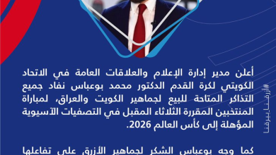 أعلن الاتحاد الكويتي لكرة القدم على حسابه الرسمي في منصة x عن نفاد تذاكر مباراة الكويت والعراق المقررة مساء الثلاثاء…