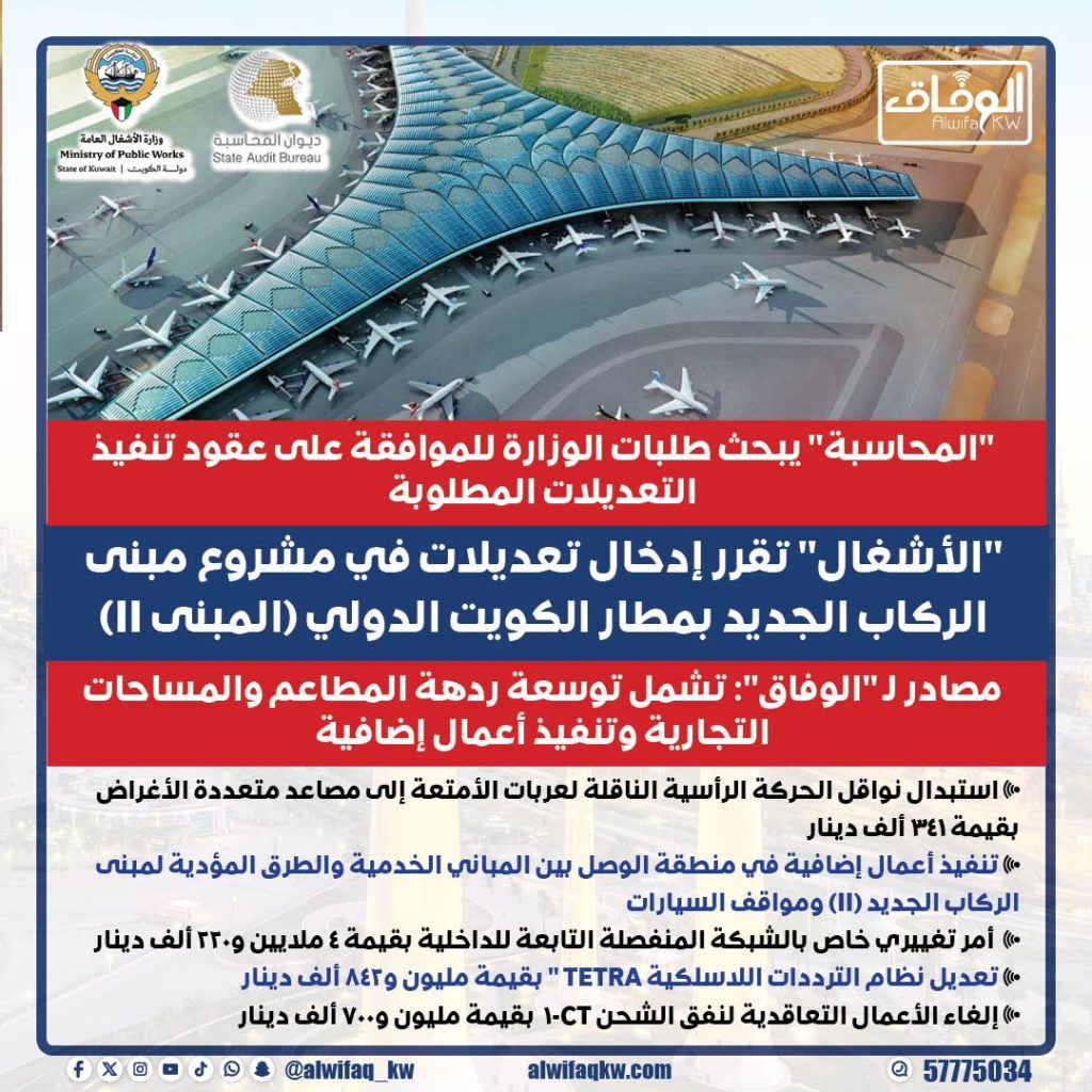 أكدت مصادر لـ “الوفاق” أن ديوان المحاسبة تلقى عددا من الطلبات من وزارة الأشغال تخص عقود مشروع مبنى الركاب الجديد بمطار الكويت الدولي (المبنى II) ومنها طلب الموافقة على العقد رقم (هـ م خ/214) إنشاء وإنجاز وتأثيث وصيانة مبنى الركاب الجديد بمطار الكويت الدولي (المبنى II) بخصوص: الأمر التغييري الخاص بتوسعة ردهة المطاعم في مبنى الركاب الجديد .