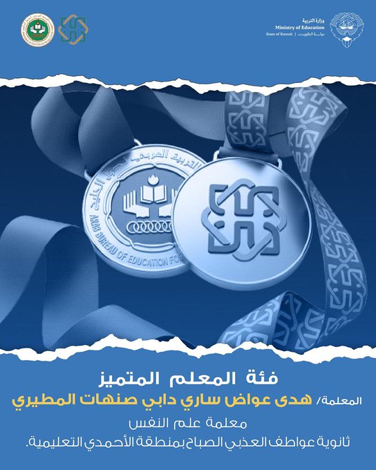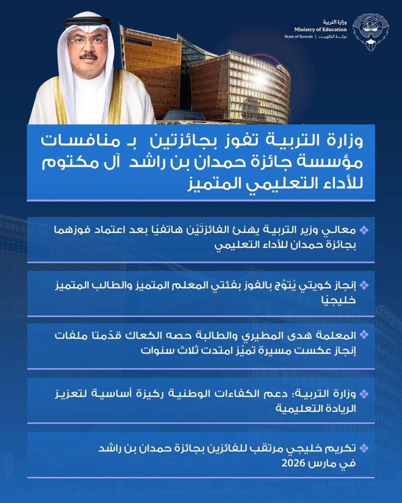 (كونا) – هنأ وزير التربية المهندس سيد جلال الطبطبائي، فائزتين من الكويت بجائزة حمدان بن راشد للأداء التعليمي المتميز، ضمن جوائز مجلس التعاون 2025، حيث أعلن اليوم الجمعة فوز معلمة علم النفس بثانوية عواطف الصباح «الأحمدي التعليمية»، هدى المطيري بفئة «المعلم المتميز» والطالبة حصة الكعاك من ثانوية فاطمة الصرعاوي «حولي التعليمية» في فئة «الطالب المتميز».