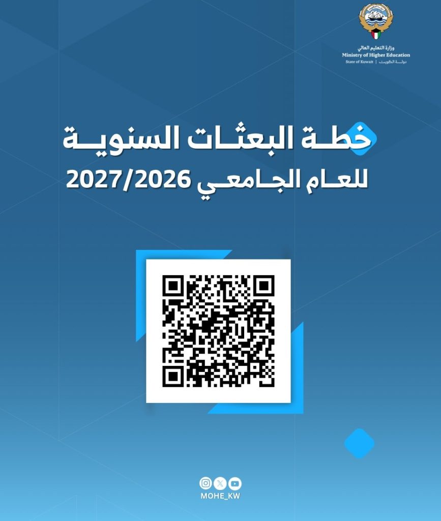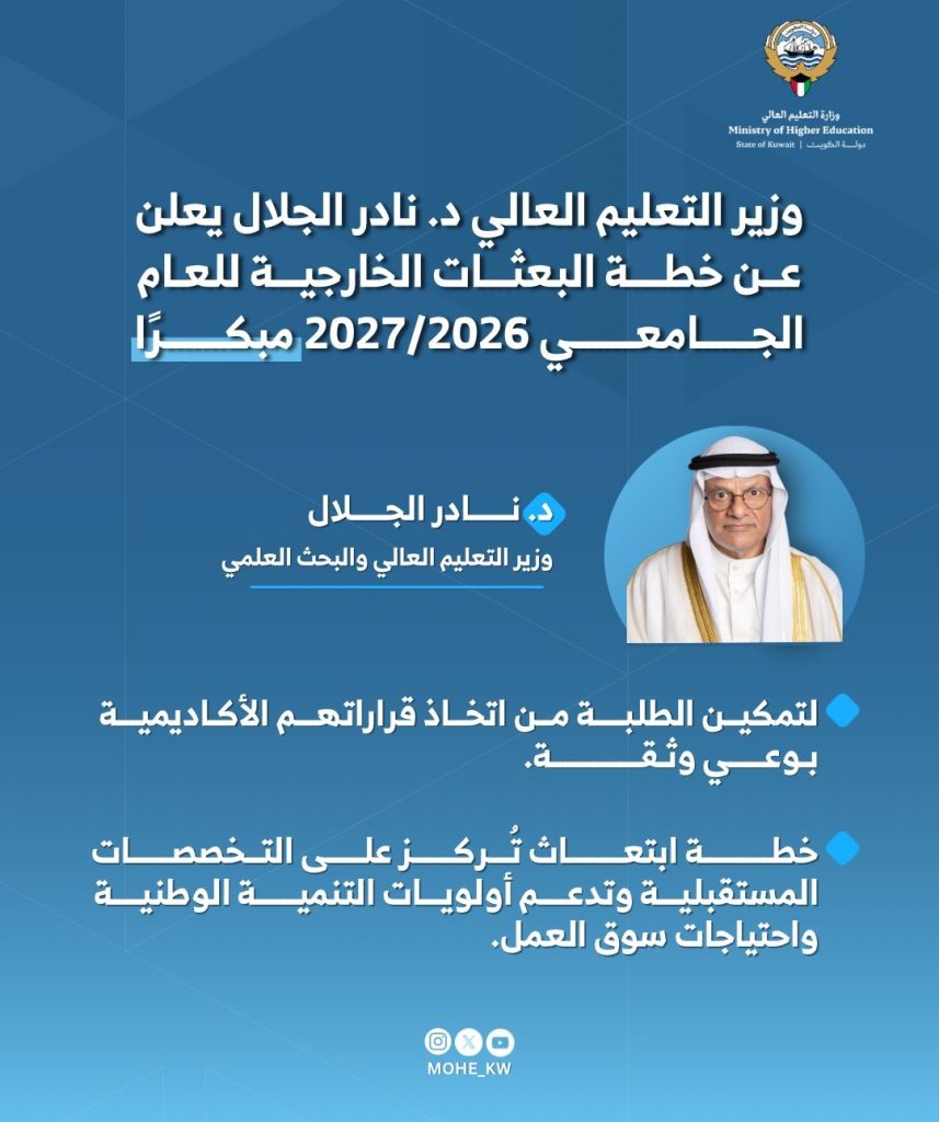(كونا) – أعلن وزير التعليم العالي والبحث العلمي الدكتور نادر الجلال، اليوم الأربعاء، عن اعتماد خطة البعثات الخارجية للعام الأكاديمي «2026 – 2027» مبكراً، وذلك بهدف تمكين الطلبة من اتخاذ قراراتهم الأكاديمية بوعي وثقة.