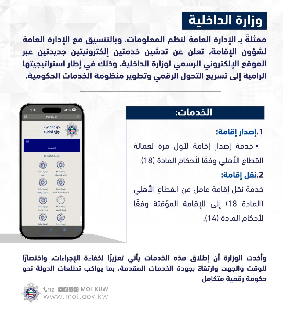 «الداخلية» تطلق خدمتين إلكترونيتين جديدتين عبر موقعها: إصدار ونقل إقامة عامل