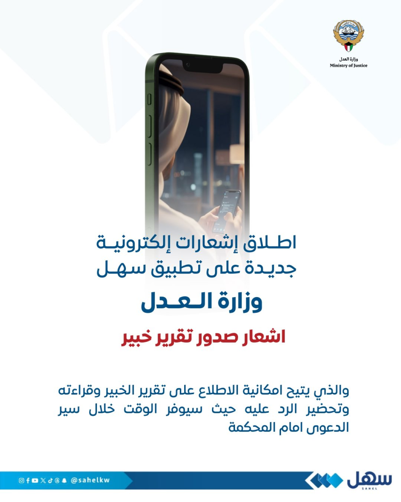 وذكرت «العدل» في بيان صحافي أن الخدمة تتيح لمقدم الطلب الاطلاع على تقرير الخبير وقراءته وتحضير الرد عليه حيث سيوفر الوقت خلال سير الدعوى امام المحكمة.