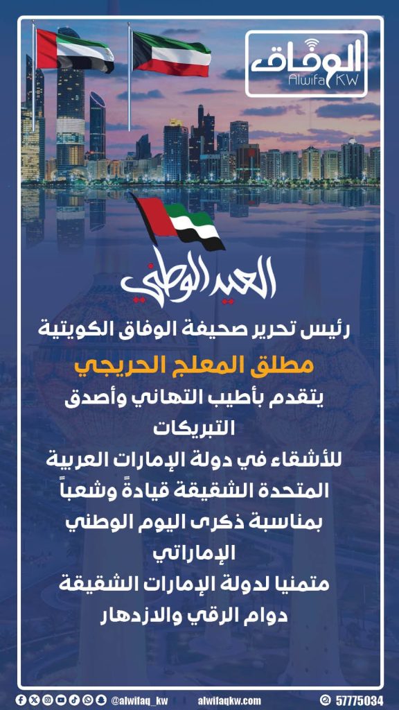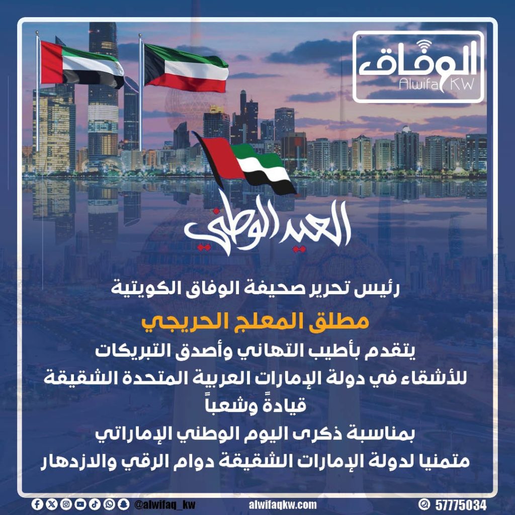 يتقدم رئيس تحرير صحيفة الوفاق الكويتية مطلق المعلج الحريجي بأطيب التهاني وأصدق التبريكات للأشقاء في دولة الإمارات العربية المتحدة الشقيقة قيادةً وشعباً بمناسبة ذكرى اليوم الوطني الإماراتي.