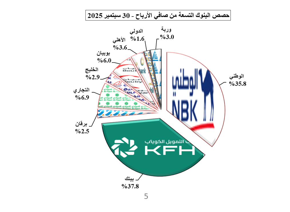 وعند المقارنة ما بين أداء البنوك، حقق بيت التمويل الكويتي أعلى مستوى أرباح بين البنوك التسعة ببلوغها نحو492.7   مليون دينار كويتي (ربحية السهم 27.98 فلس) أو نحو 37.8% من صافي أرباح القطاع المصرفي، بنمو بنحو 2.0% مقارنة مع الفترة ذاتها من عام 2024. وحقق بنك الكويت الوطني ثاني أعلى أرباح بنحو 467.4 مليون دينار كويتي (ربحية السهم 51 فلس) أو نحو 35.8% من صافي أرباح البنوك وبنسبة نمو بنحو 2.3% بالمقارنة مع الفترة نفسها من العام السابق. وبذلك، استحوذ بنكان (بيتك والوطني) على 73.6% من إجمالي أرباح البنوك، ما يرجح أن اقتصاديات الحجم في العمل المصرفي لصالح الكيانات المصرفية الكبرى. ذلك يعني أن المصارف السبعة الأخرى تشاركت في نحو 26.4% من أرباح القطاع، أعلى نسبة مشاركة كانت للبنك التجاري الكويتي بنحو 6.9%، وأدنى نسبة مشاركة كانت لبنك الكويت الدولي وبنحو 1.6%. وحقق بنك وربة أعلى ارتفاعاً نسبياً في مستوى الأرباح وبنحو 158.6%، بينما حقق بنك الخليج أكبر انخفاضاً نسبياً وبنحو -4.6%.