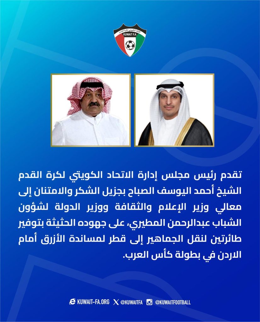 تقدم رئيس مجلس إدارة الاتحاد الكويتي لكرة القدم الشيخ أحمد اليوسف الصباح بجزيل الشكر والامتنان إلى معالي وزير الإعلام والثقافة ووزير الدولة لشؤون الشباب عبدالرحمن المطيري، على جهوده الحثيثة بتوفير طائرتين لنقل الجماهير إلى قطر .