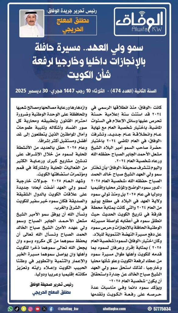واليوم تتشرف صحيفة “الوفاق” بأن تختار سمو ولي العهد الشيخ صباح خالد الحمد الصباح حفظه الله «شخصية العام 2025 » لدور سموه الواضح والمؤثر محليا وإقليميا ودوليا في عام 2025 بل ومنذ تولي سموه ولاية العهد في البلاد في مطلع يونيو من العام 2024 والتي كانت بمثابة محطة فارقة في تاريخ الكويت الحديث حيث انطلق سموه في أعقابه لمواصلة مسيرته الوطنية الحافلة بالإنجازات وحرص سموه عل دفع مسيرة النهضة التنموية للبلاد.