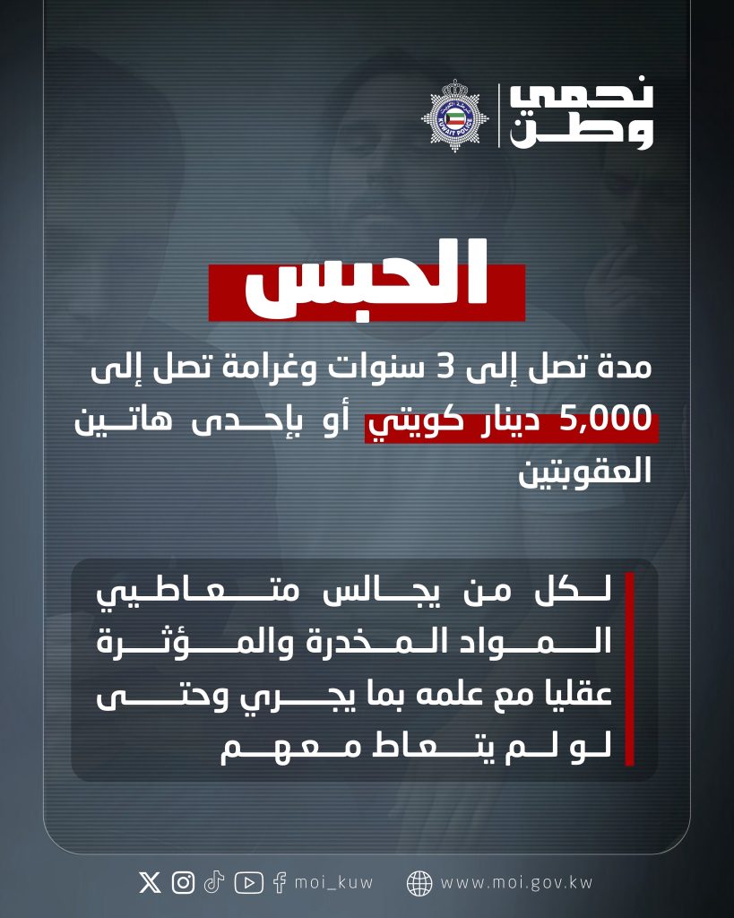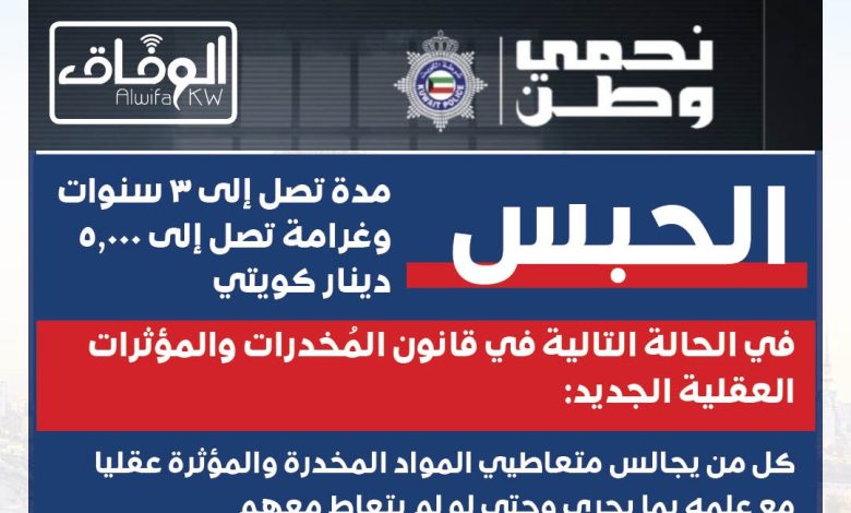 نحمي وطن| حالة الحبس 3 سنوات وغرامة 5,000 دينار في قانون المُخدرات الجديد