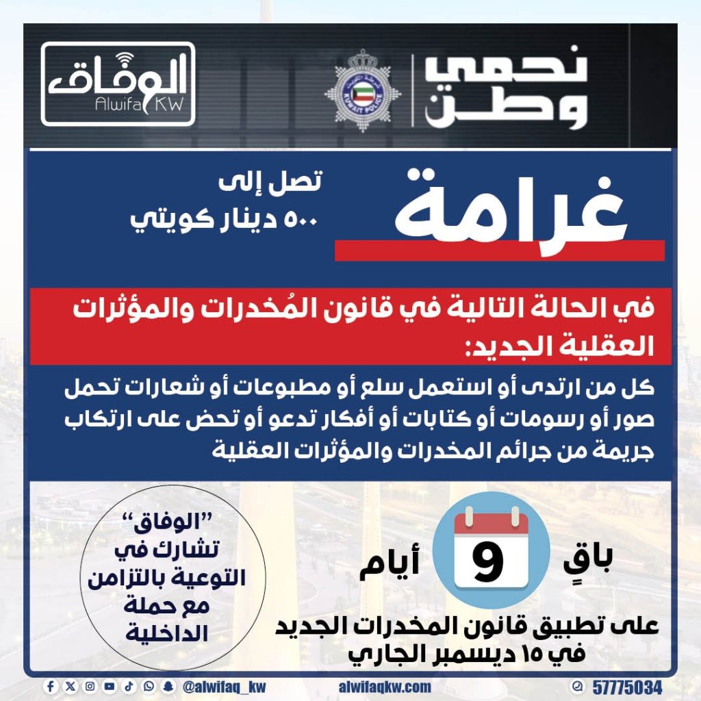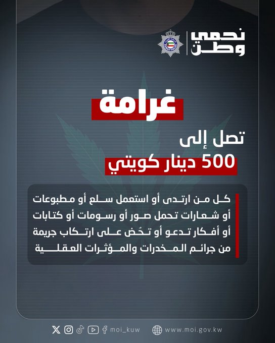 ويتضمن قانون المُخدرات والمؤثرات العقلية الجديد عقوبة غرامة تصل إلى 500 دينار كويتي ( لكل من ارتدى أو استعمل سلع أو مطبوعات أو شعارات تحمل صور أو رسومات أو كتابات أو أفكار تدعو أو تحض على ارتكاب جريمة من جرائم المخدرات والمؤثرات العقلية).