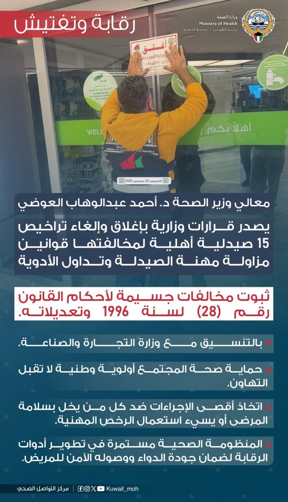 وأضاف البيان أن وزير الصحة وجه في هذا الشأن لجان التفتيش في الوزارة بالتنسيق مع وزارة التجارة والصناعة لاتخاذ إجراءات الغلق النهائي لتلك الصيدليات، وإحالة المخالفين إلى النيابة العامة لاستكمال الإجراءات القانونية بحقهم، حفاظًا على هيبة التشريع وضمانًا لردع أي تجاوزات تمس صحة المجتمع وسلامة المرضى.