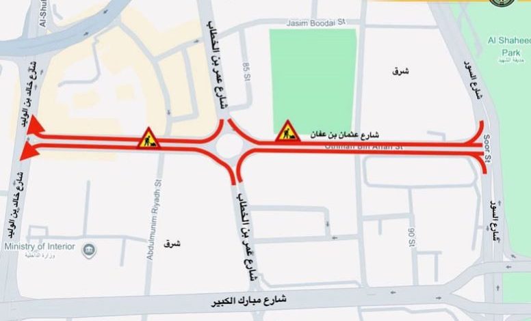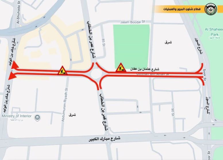 أعلنت الإدارة العامة للمرور عن إغلاق شارع عثمان بن عفان بالاتجاهين وذلك بدايةً من شارع السور إلى دوار عمر بن الخطاب إعتباراً من يوم الأثنين الموافق 19 يناير 2026 الساعة 6:00 مساءً حتى يوم الأربعاء الموافق 21 يناير 2026 الساعة 6:00 مساءً، وذلك لأعمال الصيانة اللازمة للطريق ، يرجى على قائدي المركبات إتخاذ طرق بديلة .