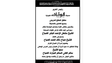 رئيس تحرير صحيفة الوفاق الكويتية مطلق المعلج الحريجي وجميع العاملين بالصحيفة يتقدمون بخالص العزاء وصادق المواساة لمقام سمو أمير البلاد…
