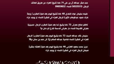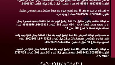 – خالد عبدالله غريب وطين العازمي: 58 عاما – بعد صلاة العشاء اليوم الجمعة. الرجال: العزاء في المقبرة فقط. تلفون:…